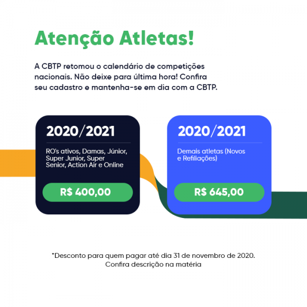 Você que ainda não está em dia com a CBTP neste ano de 2020 será beneficiado com um super desconto. Dessa forma além de garantir sua participação nos campeonatos do próximo ano, ainda pode aproveitar o ano de 2020 para competir.