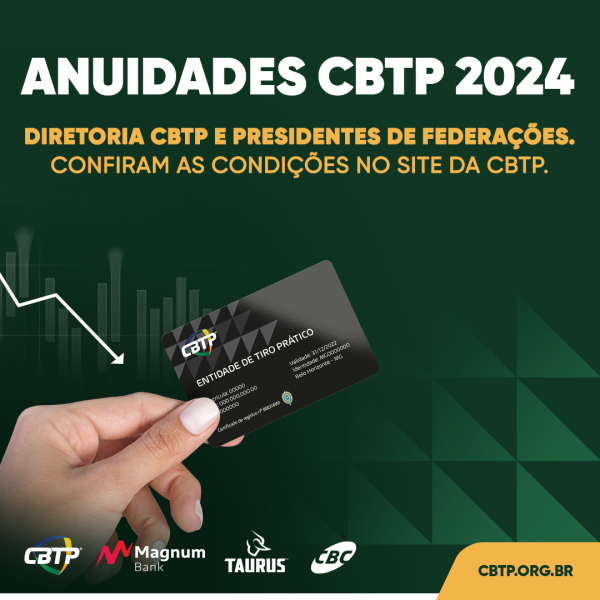 Conforme definido durante assembleia de previsão orçamentária 2023, a Confederação Brasileira de Tiro Prático (CBTP) vem comunicar que as anuidades de sua diretoria eleita e nomeada, juntamente com os presidentes das federações filiadas a CBTP receberão um desconto para o ano de 2024.