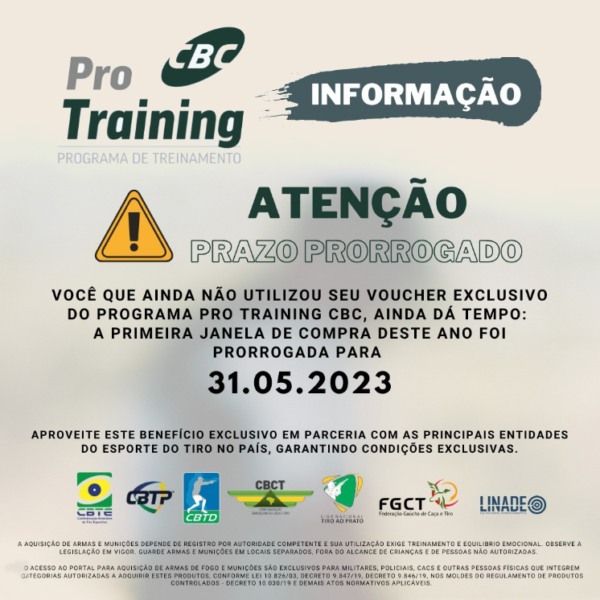 A Confederação Brasileira de Tiro Prático (CBTP), vem comunicar que a primeira janela de compras do Programa Pro Training 2023 da Companhia Brasileira de Cartuchos (CBC), foi prorrogada para o dia 31 de Maio.