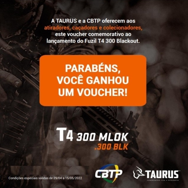 É com prazer que a Confederação Brasileira de Tiro Prático (CBTP) em parceria com a patrocinadora oficial Taurus contempla a todos os confederados com o voucher de 10 % de desconto para a compra do super lançamento do T4 300 MLOK.
