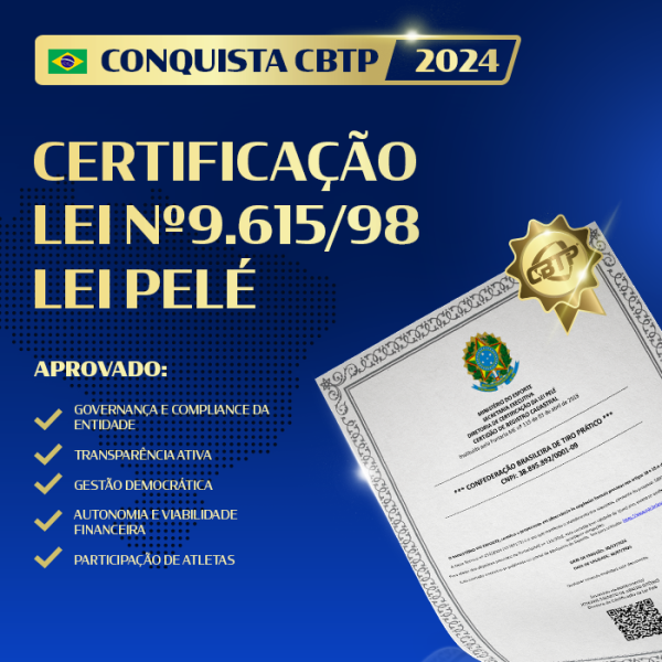 A Confederação Brasileira de Tiro Prático (CBTP), com muita alegria, vem compartilhar mais uma grande conquista para todos os associados. Nesta terça-feira, dia 30 de julho de 2024, recebemos as CERTIFICAÇÕES 18 e 18A pela Lei nº 9.615/1998 – Lei Pelé, possibilitando que a CBTP possa captar recursos em prol de seus atletas, através de fundos provindos do Ministério do Esporte.