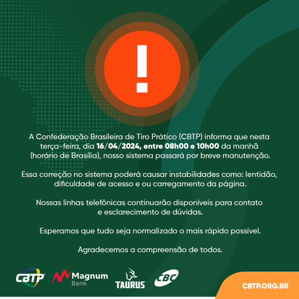 A Confederação Brasileira de Tiro Prático (CBTP) informa que nesta terça-feira, dia 16/04/2024, entre 08h00 e 10h00 da manhã (horário de Brasília), nosso sistema passará por breve manutenção.