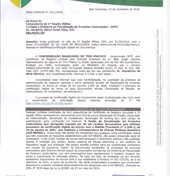 CBTP protocola ofício na 2ª Região Militar referente a assinatura digital ICP e utilização de QRcode.