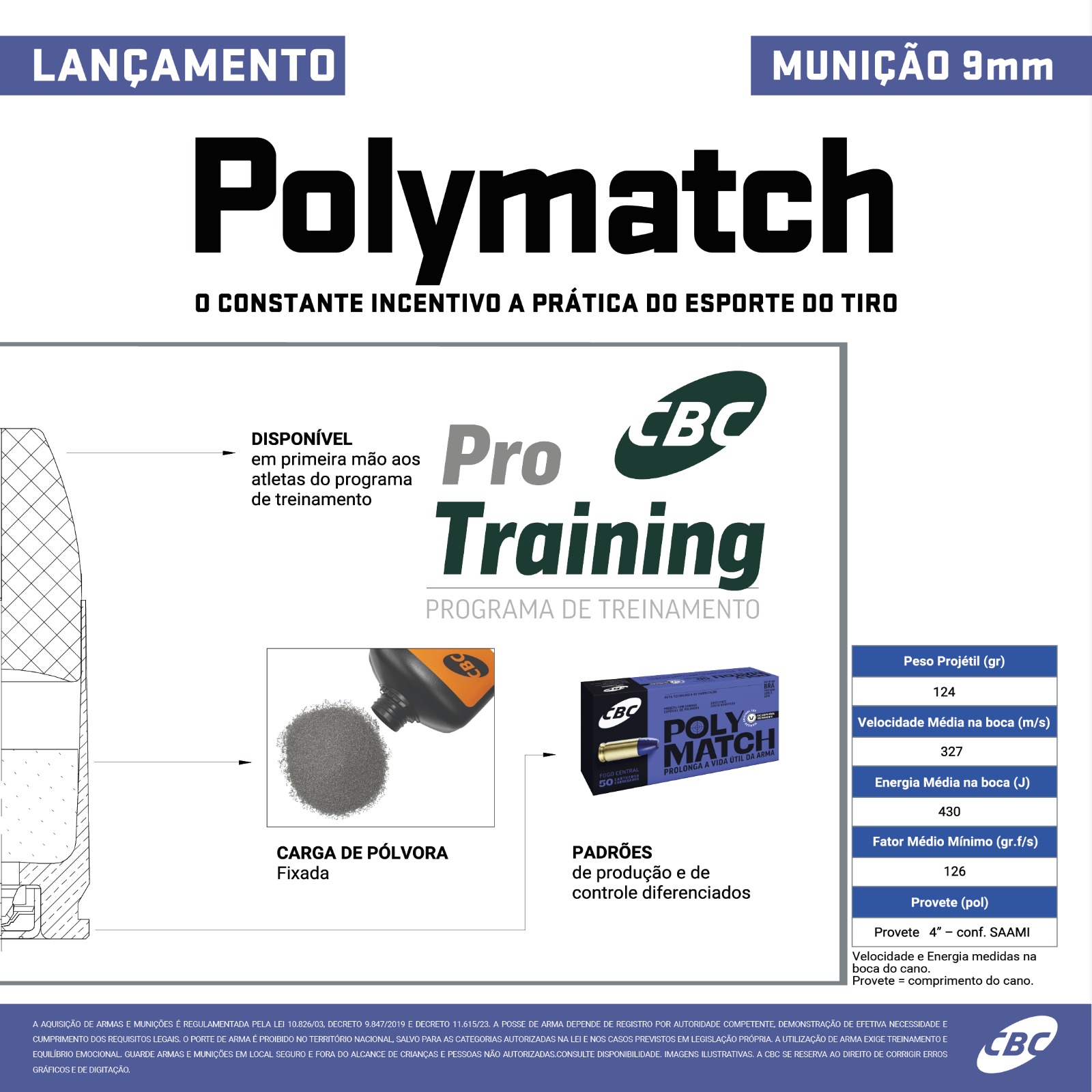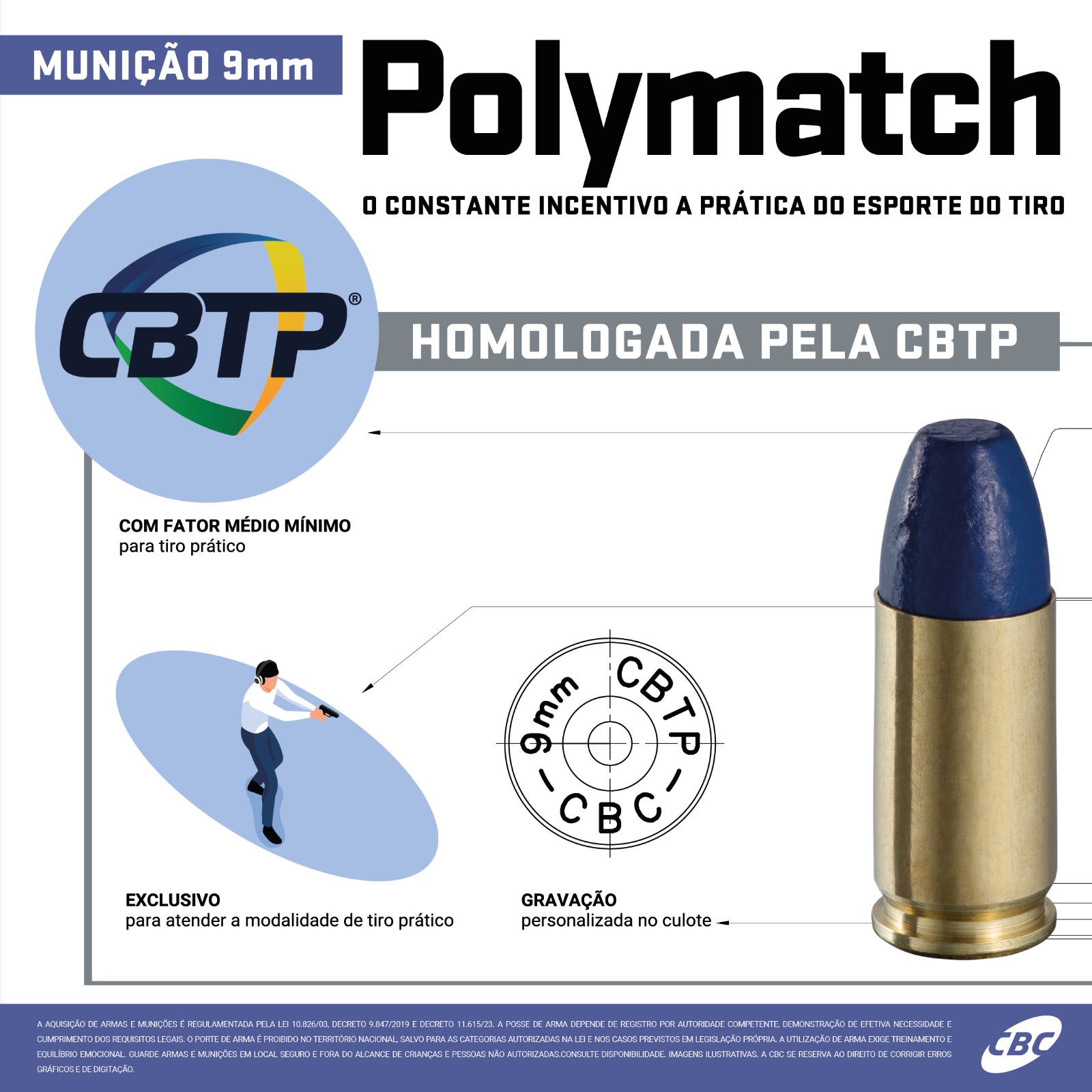 A Confederação Brasileira de Tiro Prático (CBTP) em parceria com a Companhia Brasileira de Cartuchos (CBC), tem honra de apresentar a NOVA MUNIÇÃO 9mm POLYMATCH desenvolvida para aprimorar a prática de nossos atletas do tiro desportivo.