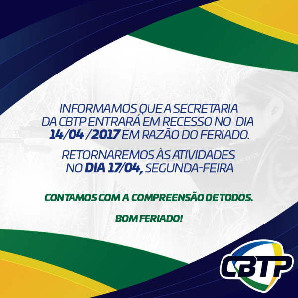 Informamos que a Secretaria da CBTP entrará em recesso nesta sexta-feira 14/04/2017 em razão do feriado.
