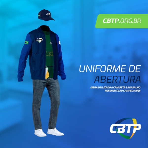 UNIFORME CERIMONIA DE ABERTURA: Boné, Agasalho e Camisa Oficial CBTP (referente ao Campeonato 2018), Calça Jeans e Tênis.