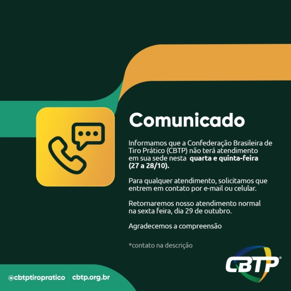A Confederação Brasileira de Tiro Prático (CBTP) informa que entre os dias 27 e 28 de outubro, a sede em Belo Horizonte não estará com funcionamento presencial.
