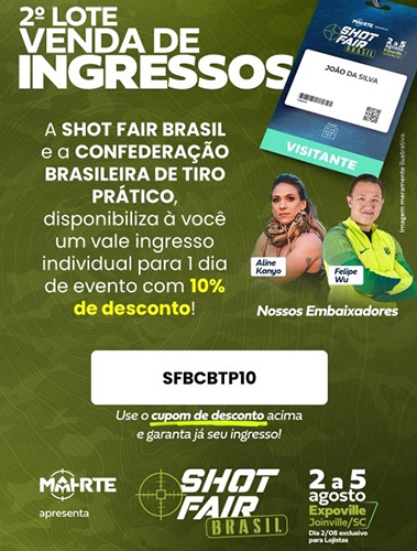 A CBTP informa a todos os nossos filiados que o 2ºlote de ingressos para a SHOT FAIR BRASIL já está disponível para compras no site do evento.