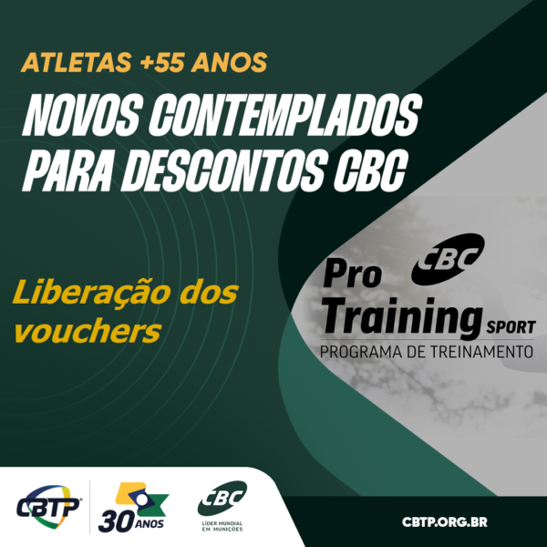 Atenção Atletas com mais de 55 anos! A Confederação Brasileira de Tiro Prático (CBTP) informa que seu voucher do Programa Pro Training CBC já está disponível através do login de atleta no site da CBTP.