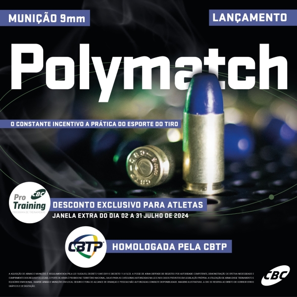 A Confederação Brasileira de Tiro Prático (CBTP) em parceria com a Companhia Brasileira de Cartuchos (CBC), tem honra de apresentar a NOVA MUNIÇÃO 9mm POLYMATCH desenvolvida para aprimorar a prática de nossos atletas do tiro desportivo. Aprovada pela CBTP, a POLYMATCH segue padrões de produção e de controle de qualidade diferenciados, oferecendo um fator médio…