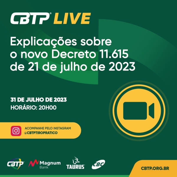 A Confederação Brasileira de Tiro Prático (CBTP) informa que na próxima segunda-feira, dia 31 de Julho, às 20h00 (horário de Brasília) será realizada uma transmissão ao vivo no Instagram da Confederação para auxiliar e orientar a todos os nossos associados, no entendimento do novo Decreto nº 11.615, publicado no dia 21 de julho de 2023 pela Presidência da República.