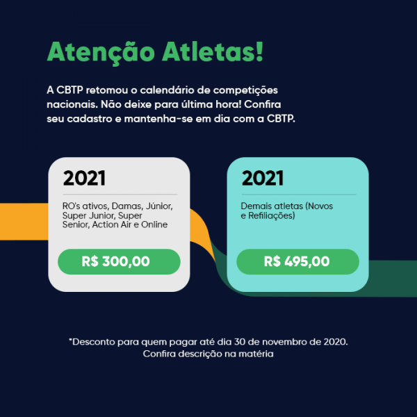 Se você já está em dia com sua anuidade de 2020 da CBTP e ainda não pagou a de 2021, corre que ainda dá tempo de aproveitar um super desconto.  Até o dia 30 de novembro, você paga apenas R$ 495,00.